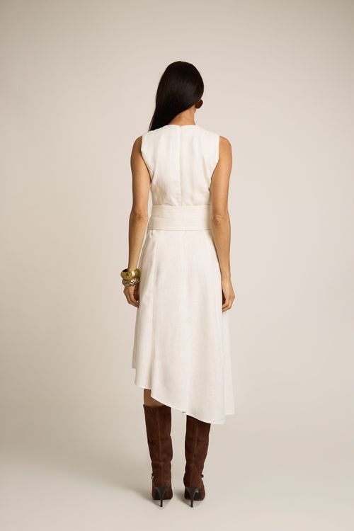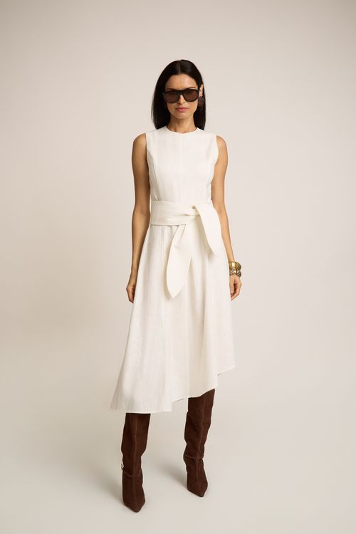 refinado e atemporal. A cintura média com elástico e amarração frontal proporciona ajuste confortável e