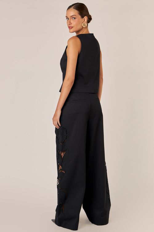 Modelagem reta com elástico na cintura, comprimento midi e fendas laterais.